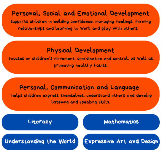 Three prime areas are particularly important for learning and forming relationships. They build a foundation for children to thrive and provide the basis for learning in all areas. Children will also be supported in the other four specific areas, which help strengthen and develop the three prime areas, and ignite children’s curiosity and enthusiasm.